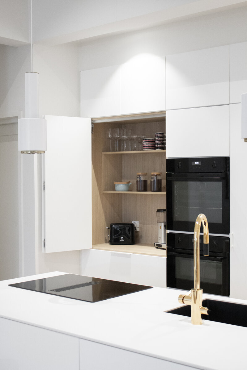 Tuotteista Huusholli Keittiöt käyttää laajasti lähes koko R Mokin valikoimaa: esimerkiksi WingLine-taiteovijärjestelmiä ja aamiaiskaappien kiskoja, altaita, vetimiä, kalustejalkoja ja välitilalevyjä.