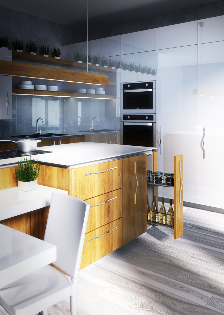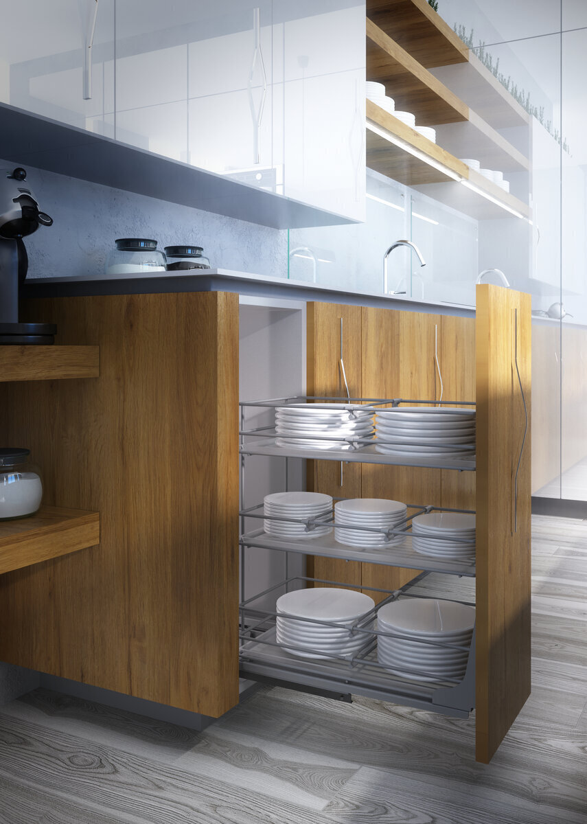 Karusellien ja vetohyllyköiden avulla alakaapit ja kapeat kaapit pysyvät näppärästi järjestyksessä. Ne muuntavat kätevästi myös kapeimpien ja syvimpien kolojen syvänteet säilytystilaksi, jossa ruoka-aineet, astiat ja keittiön tarvikkeet pysyvät järjestyksessä ja helposti käden ulottuvilla.