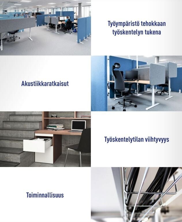 Kokonaisvaltainen toimistoympäristön toimivuus on yksi yrityksemme tuotevalikoiman osa-alueista, ja valikoimastamme löytyykin kattava tarjonta tuotteita toimiston viihtyvyyteen, ergonomisuuteen ja käytännöllisyyteen. Lisäksi toteutamme myös räätälöityjä ratkaisuja, juuri sinun tarpeittesi mukaan.