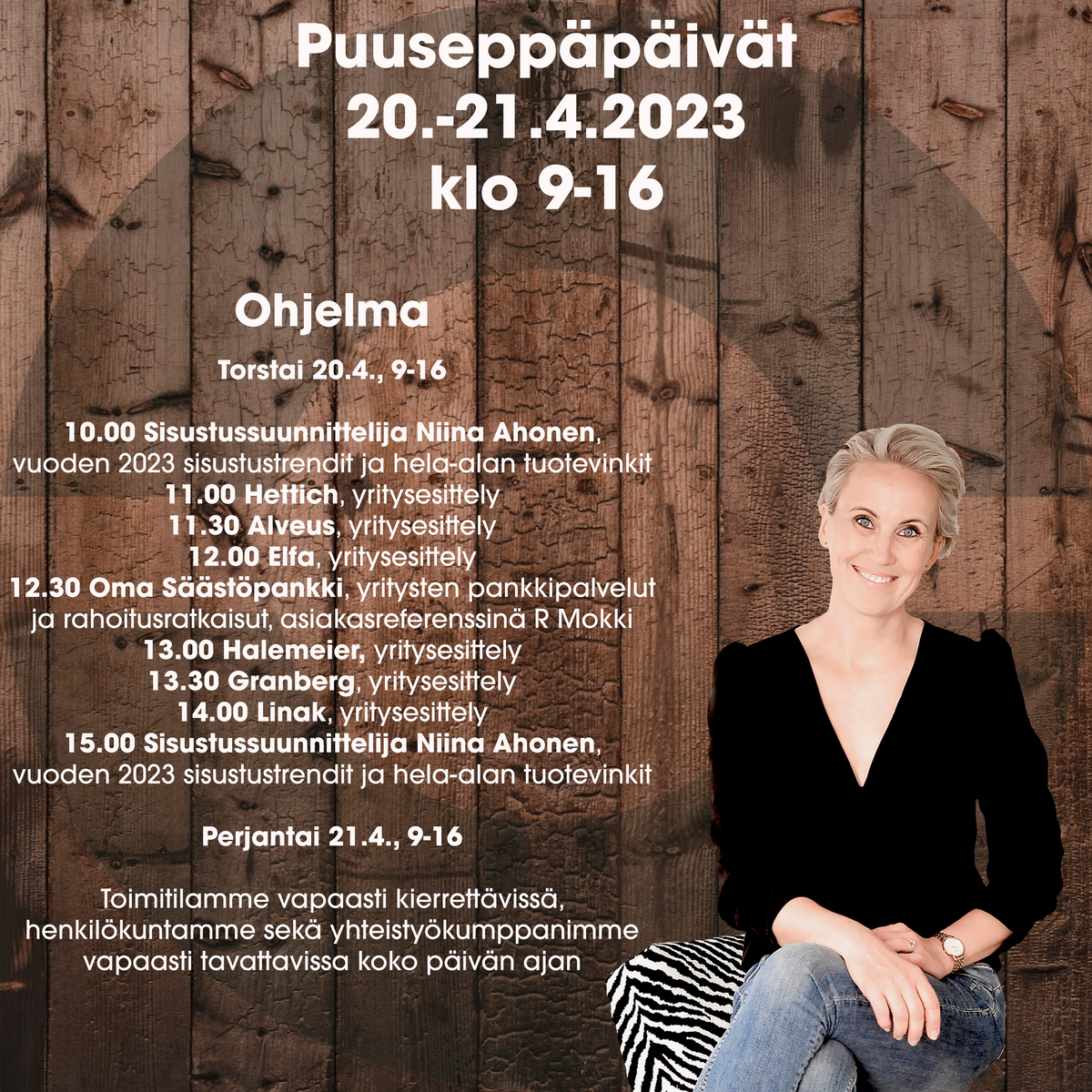 Paikan päällä tiloissamme on kuultavissa ja nähtävissä toimittajiemme, mm. Hettich, Alveus, Halemeier, Granberg, Linak ja Elfa, yritys- ja tuote-esittelyitä. Lisäksi toimittajamme Mever sekä puuntyöstökoneita toimittava Awutek esittelevät tuotteitaan varastomme puolella. Yhteistyökumppanimme ovat tavattavissa koko Puuseppäpäivien ajan tiloissamme. Myös yhteistyökumppanimme Oma Säästöpankki tulee pitämään mielenkiintoisen puheenvuoron yritysten toimintaan liittyen.