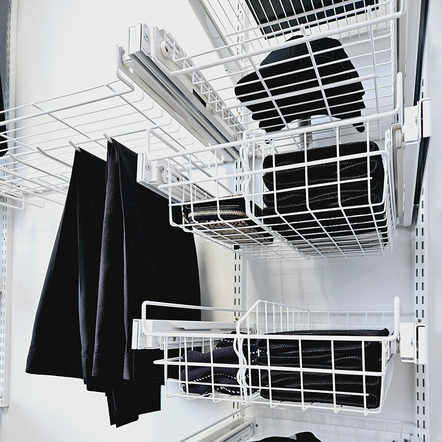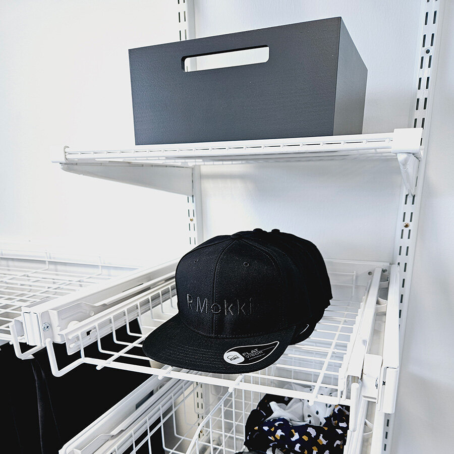 Hatut, pipot, hanskat ja muut pienemmät tavarat on suositeltavaa säilyttää ulosvedettävissä koreissa ja hyllykoukuissa. Jakamalla vetokorit pienempiin osastoihin rullakorin jakajilla, kaikille tavaroille saa oman paikkansa. Hyllykoukkuihin voi ripustaa esimerkiksi lippalakit, laukut ja avaimet.
