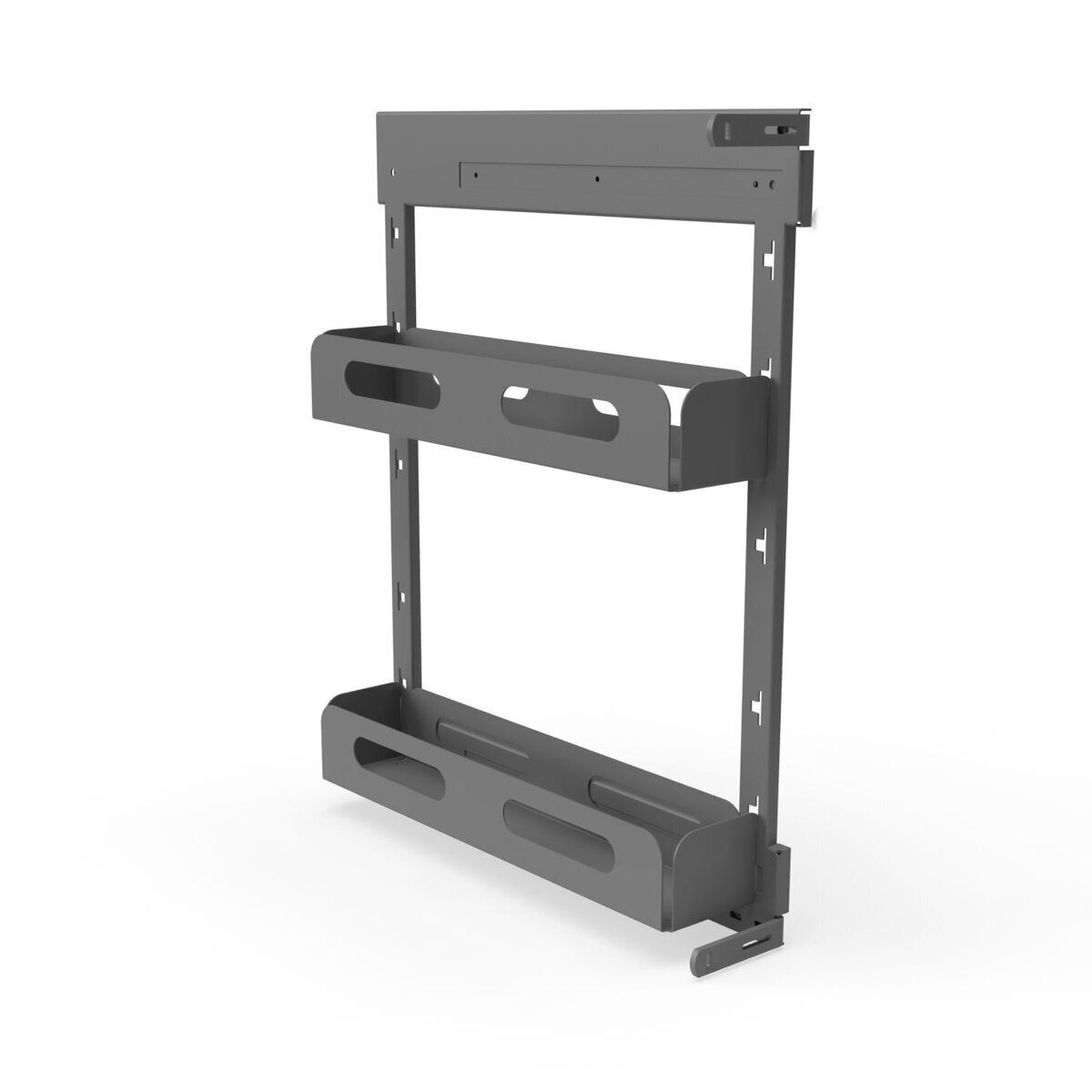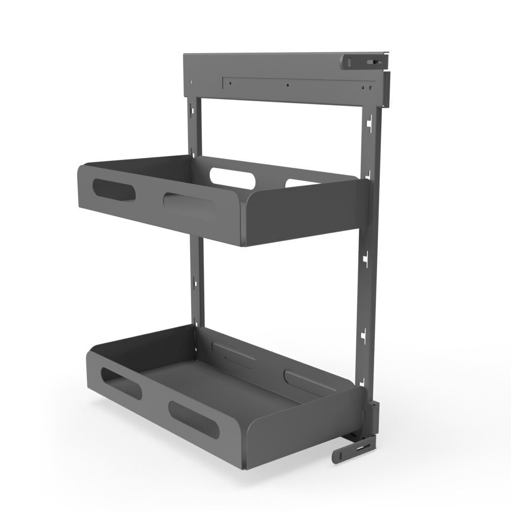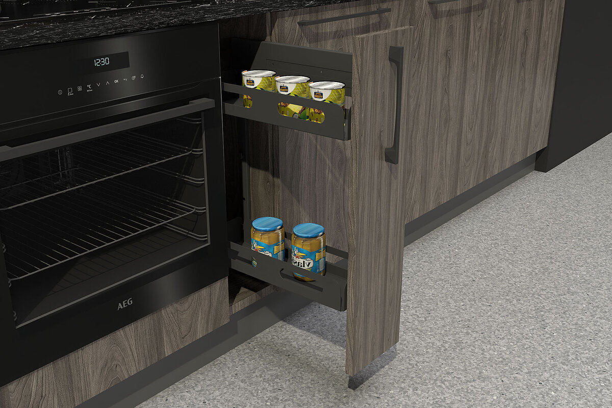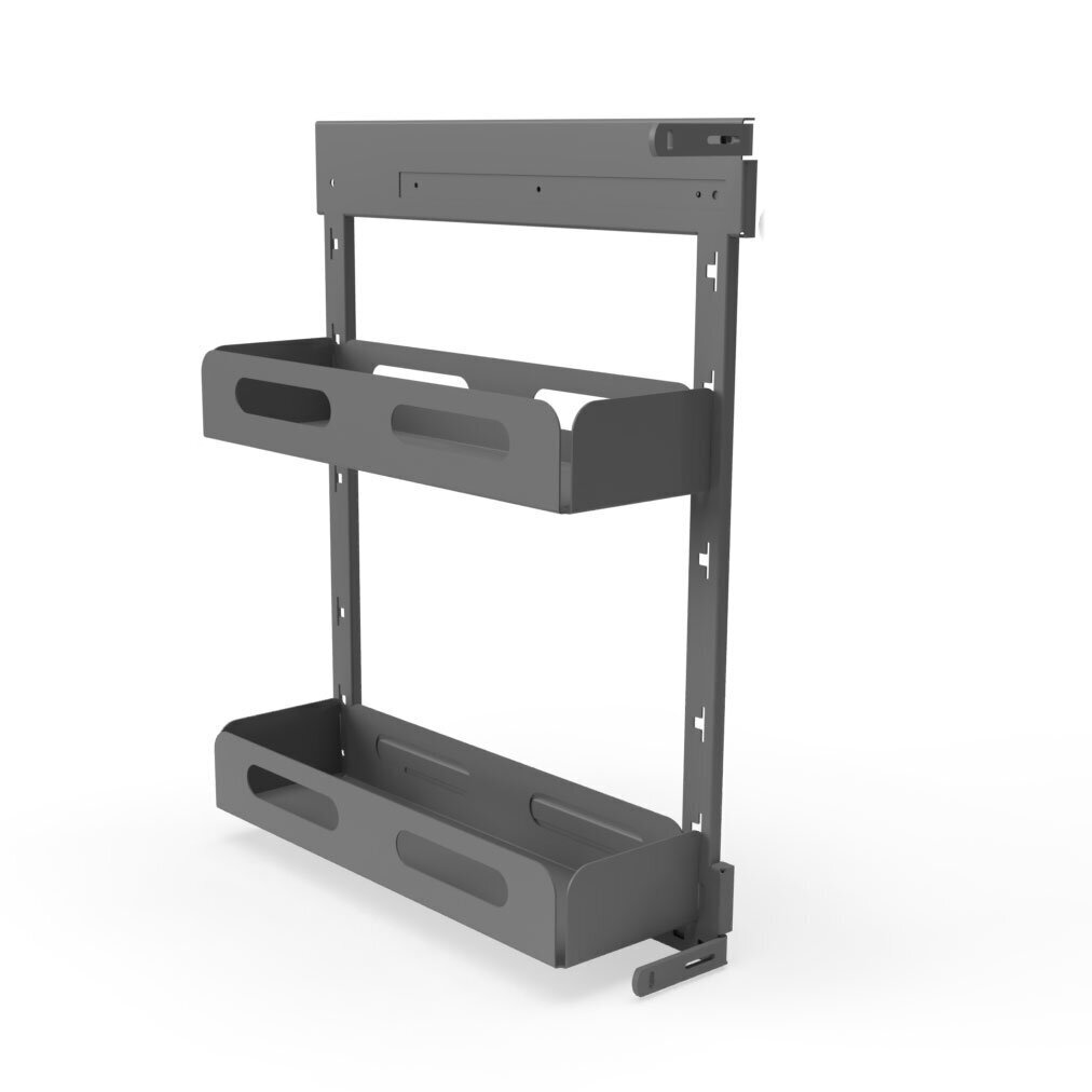 Etusarjakiinnitteinen vetohyllykkö kahdella hyllyllä sopii loistavasti esimerkiksi keittiön siivousvälineiden tai muiden pienten tavaroiden säilyttämiseen, eikä se vie keittiöstä paljoa tilaa. Hylly on väriltään kaunis antrasiitti.