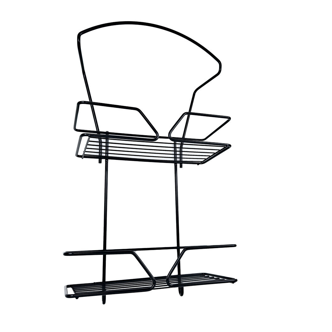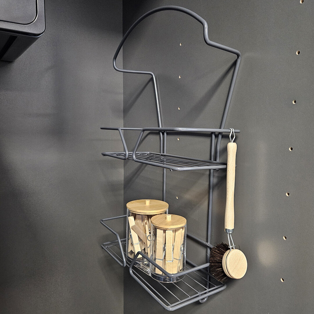 Antrasiitin värinen lankahyllykkö siivouvälineille. Siivousvälinetelineessä on paikka imuriletkulle, kaksi tarvikehyllyä ja kaksi koukkua. Kätevä säilytysratkaisu siivoustarvikkeille.