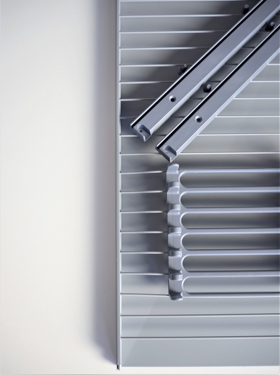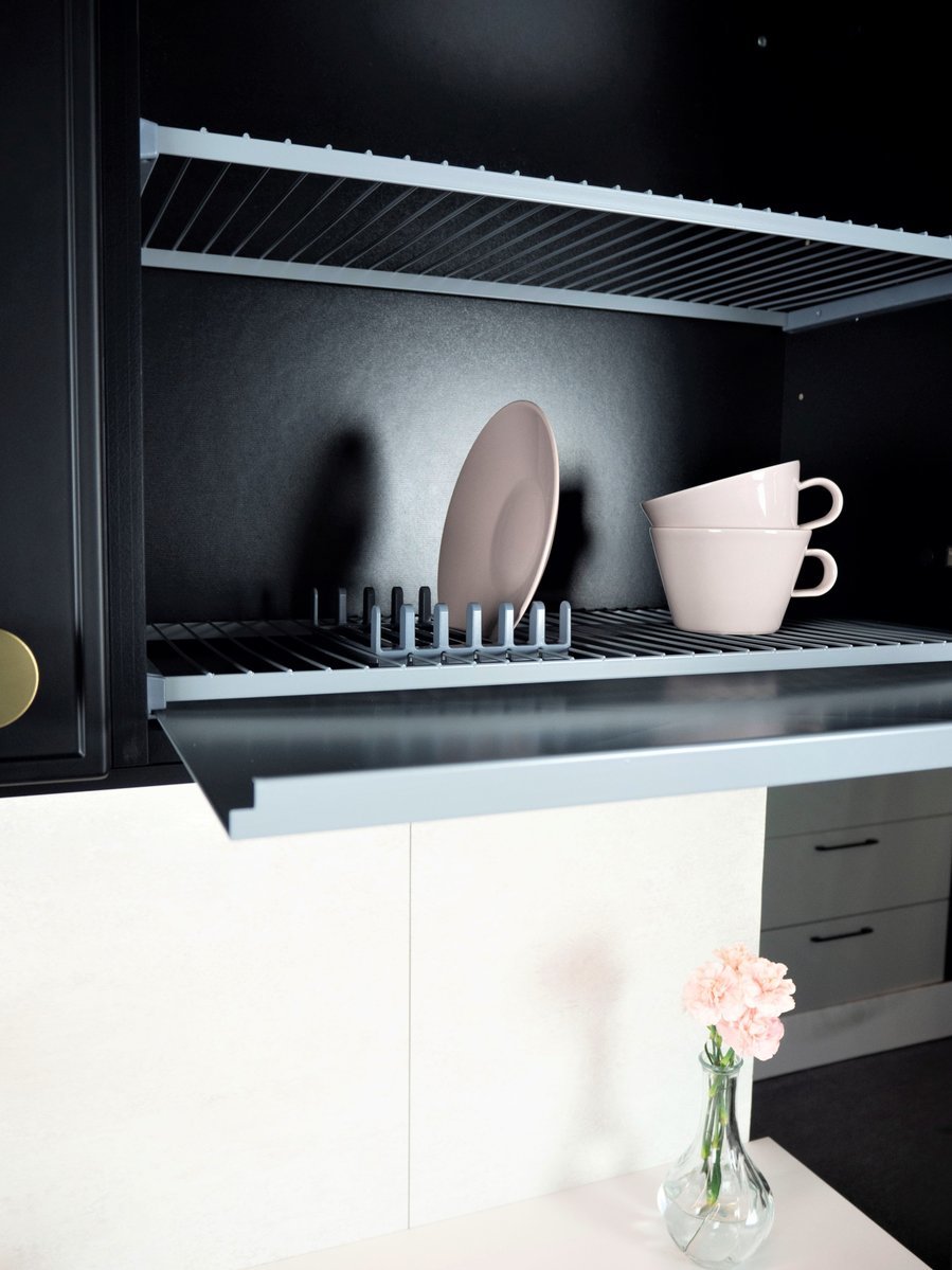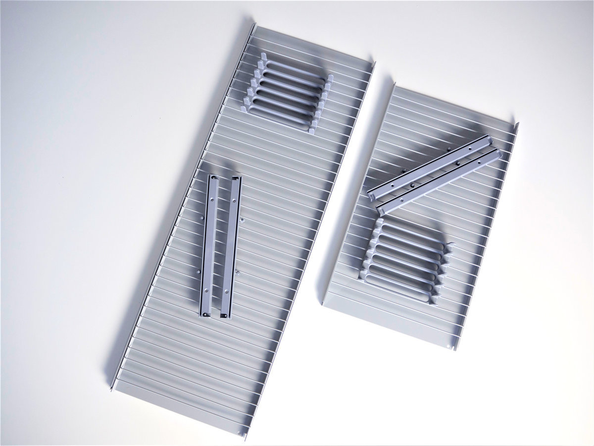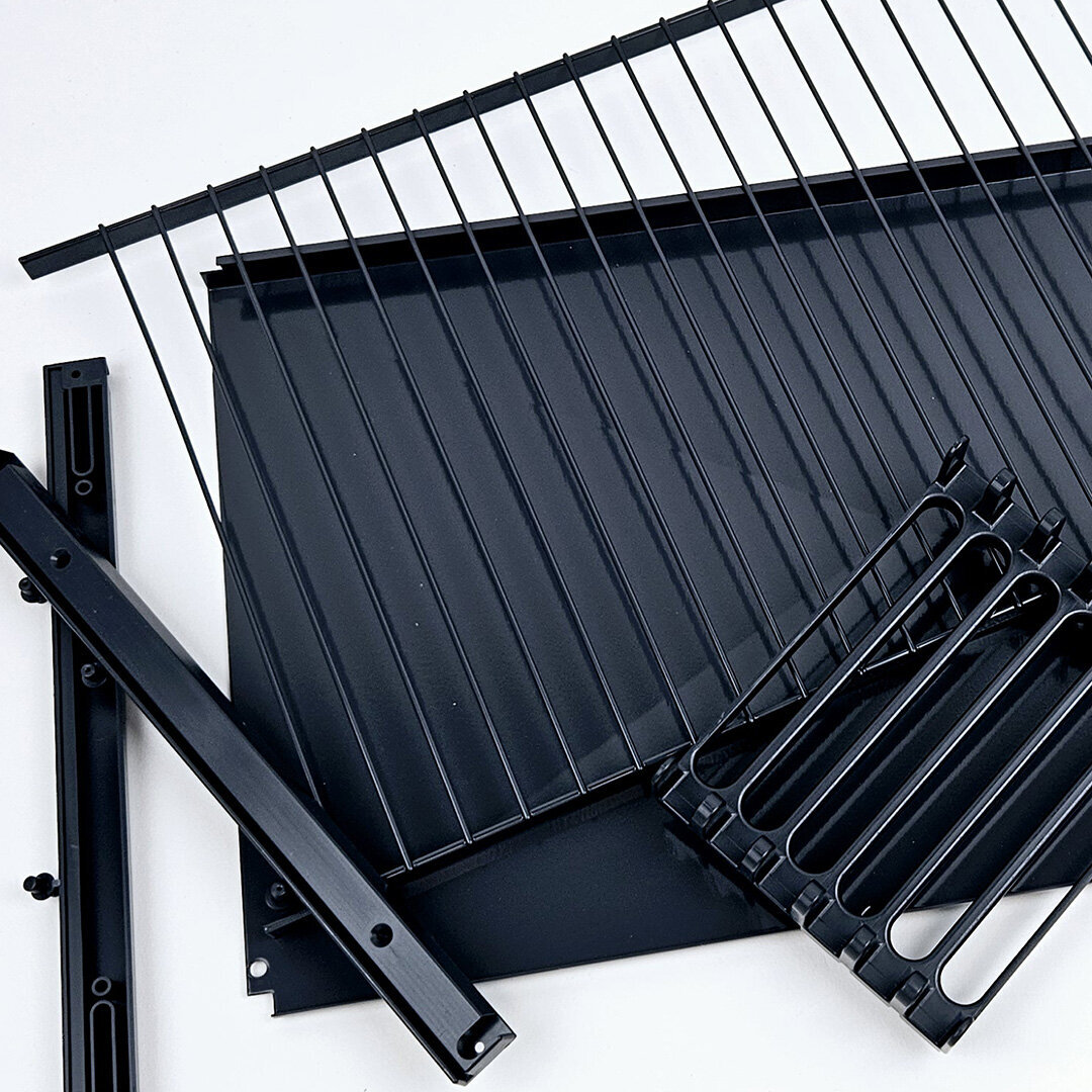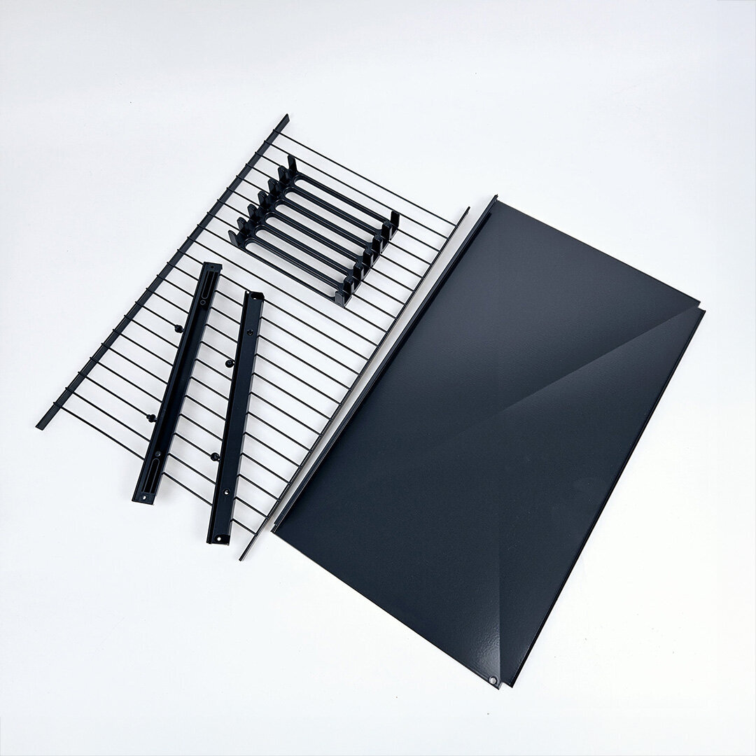 Kotimainen Teema-tasohyllysetti sisältää hyllyn, kannattimet, tippuvesisuojan sekä lautastelineen.  Saatavilla viidessä eri koossa. Vesisuoja helposti irrotettavissa. Valmistettu teräksestä ja maalattu epoksilla harmaan  ja antrasiitin sävyissä.