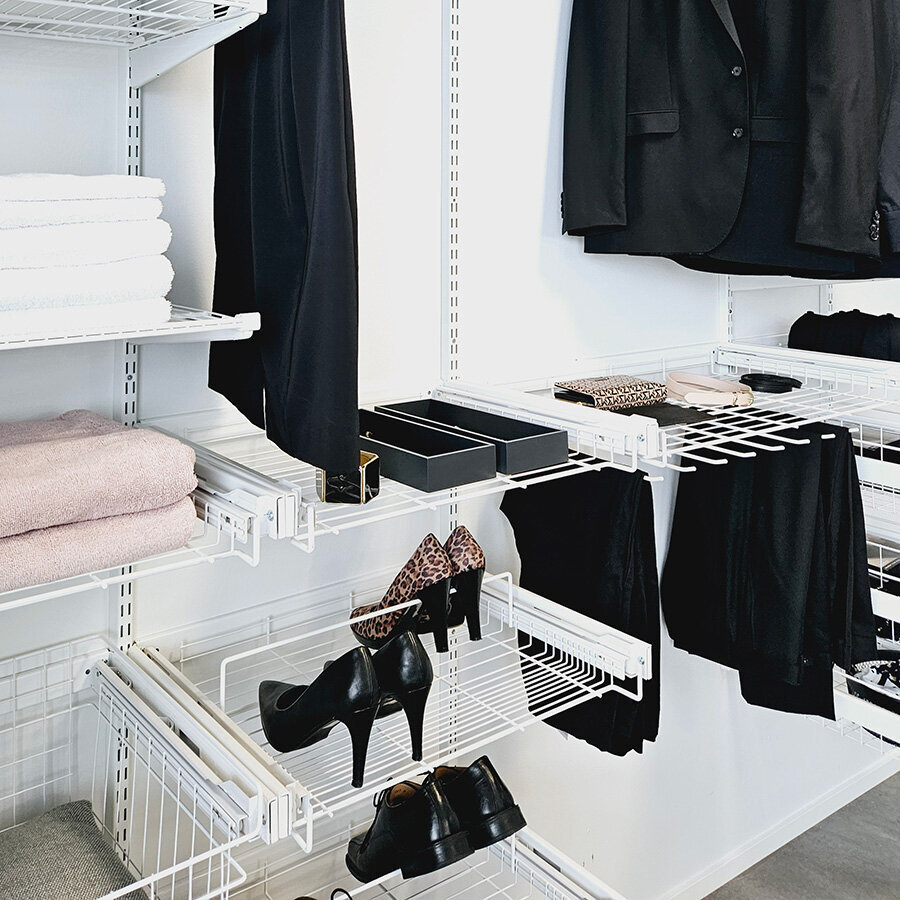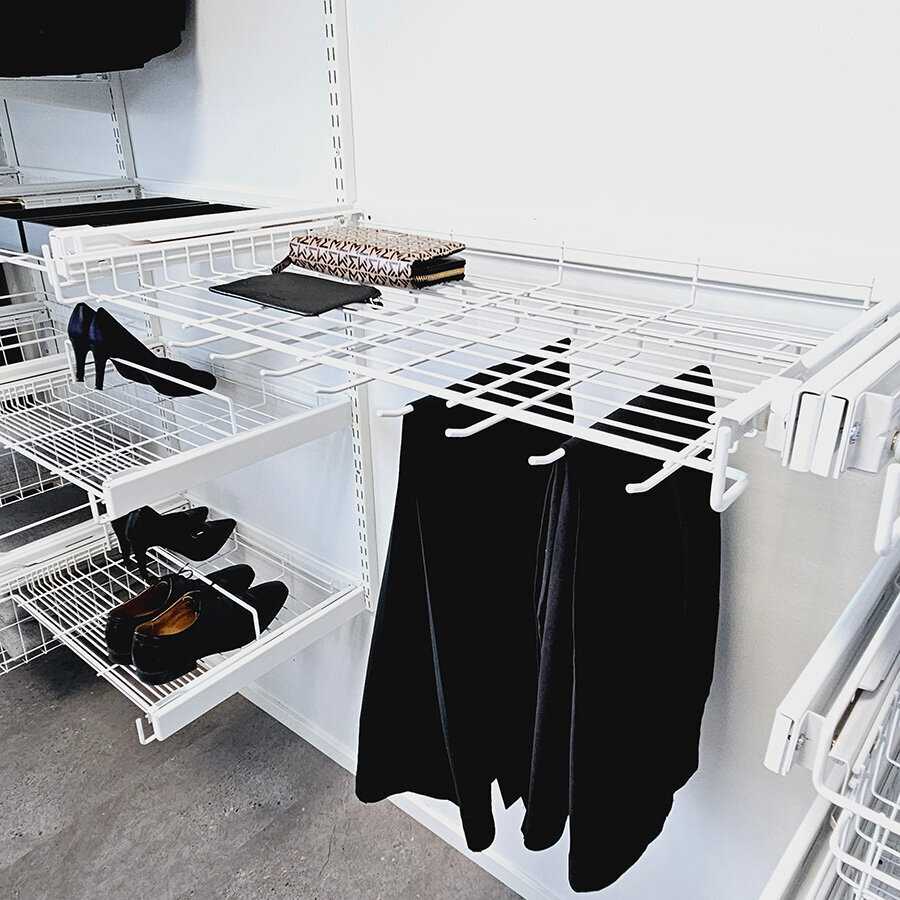 Ulosvedettävien kiskojen avulla voi hyödyntää kaiken käytettävissä olevan tilan. Monikäyttöisten seinäkiskojärjestelmätuotteiden avulla voiluoda olemassa oleviin kodin komeroihin ja liukuovikaapistoihin täydellisen säilytysjärjestelmän.