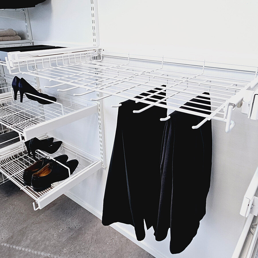 Ulosvedettävien kiskojen avulla voi hyödyntää kaiken käytettävissä olevan tilan. Monikäyttöisten seinäkiskojärjestelmätuotteiden avulla voiluoda olemassa oleviin kodin komeroihin ja liukuovikaapistoihin täydellisen säilytysjärjestelmän.