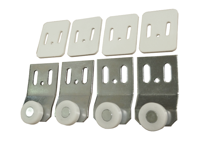 Materiaali: Metalli, valkoinen. Liukuoven pyörästö ja alaohjaimet kahdelle ovelle. Kantavuus 30kg/ovi.