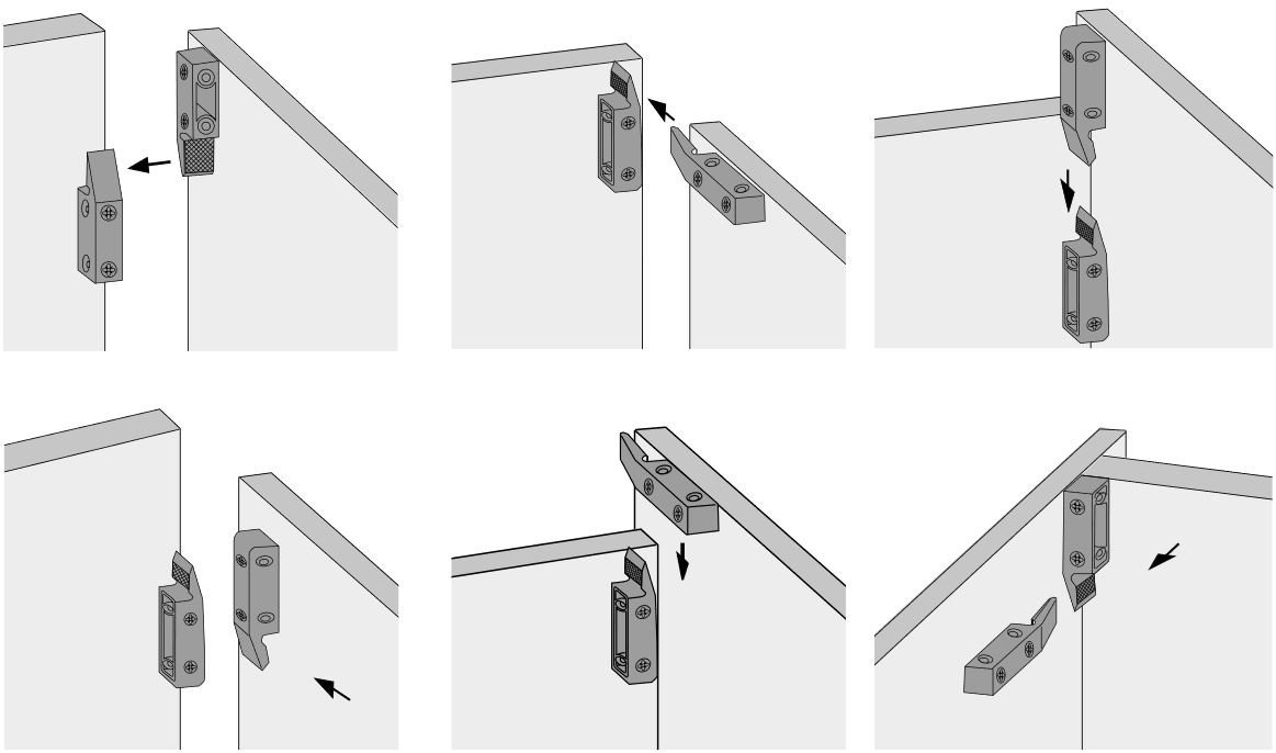 Erilaiset ruuviasentovaihtoehdot mahdollistavat kiinnityksen ylhäältä, edestä, sivulta sekä tasolle. Klipsiliittimet voidaan kohdistaa täydellisesti. Soveltuu mittausvirheiden kompensointiin.