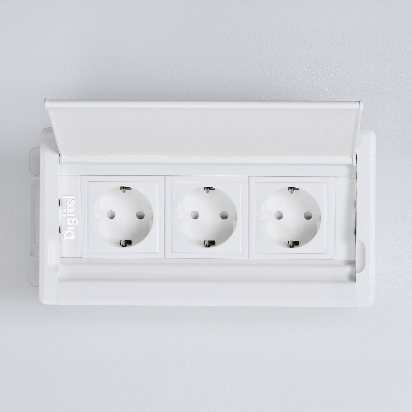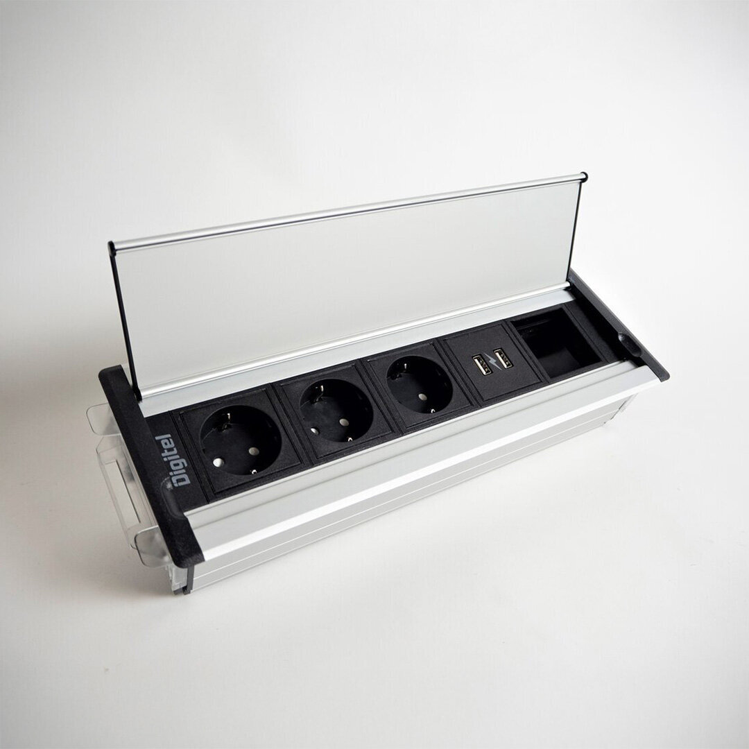Tasoon upotettava kompakti kannellinen pistorasia kolmella pistokkeella sekä kahdella USB portilla.