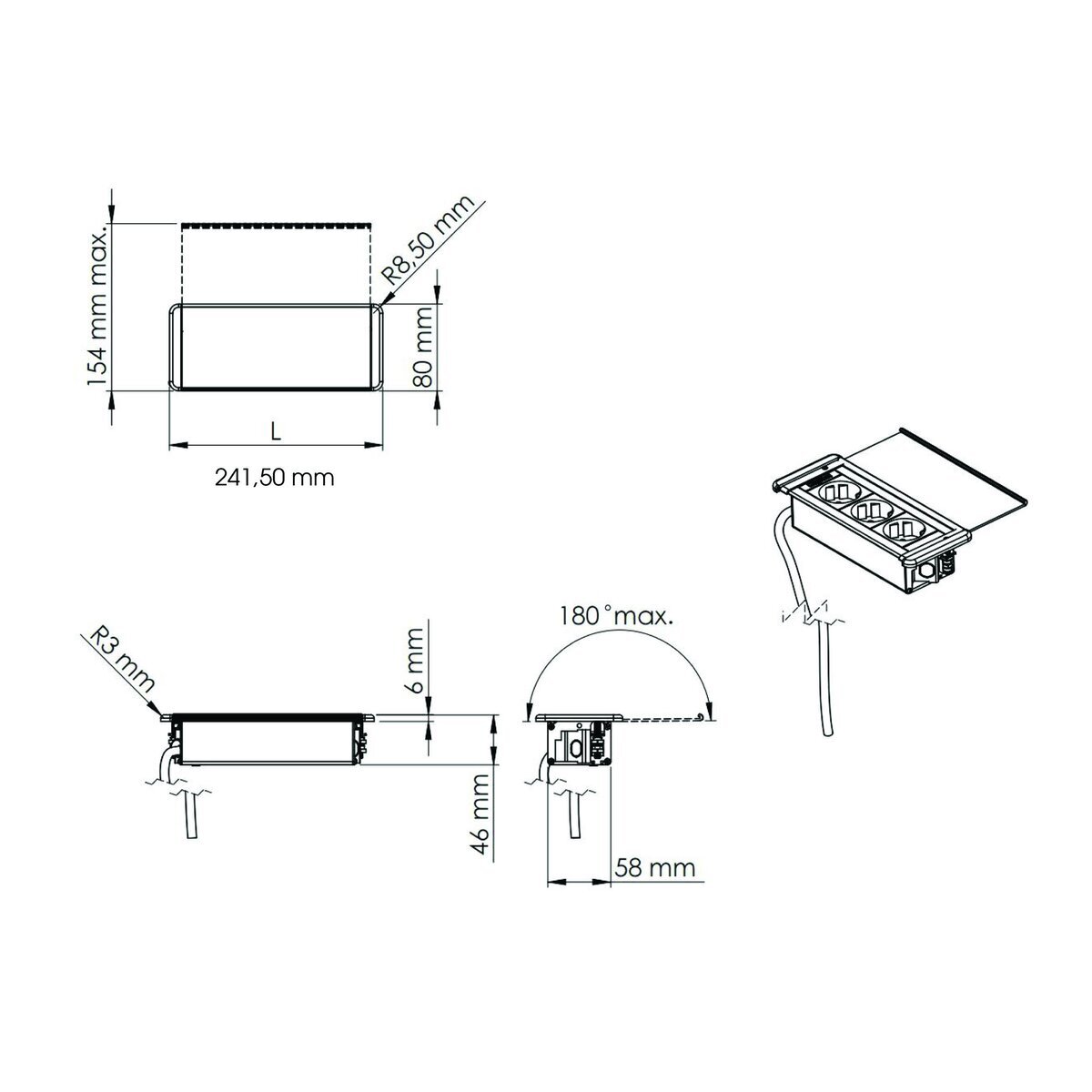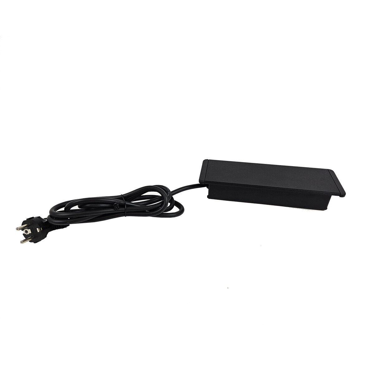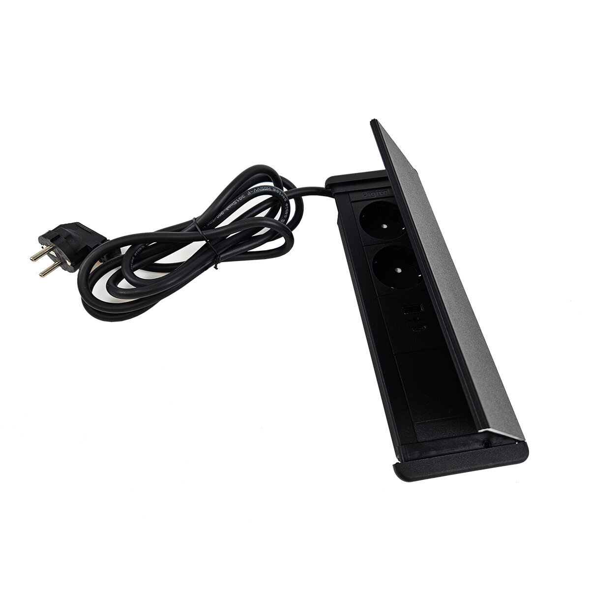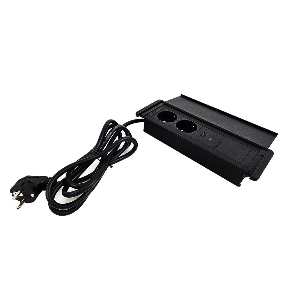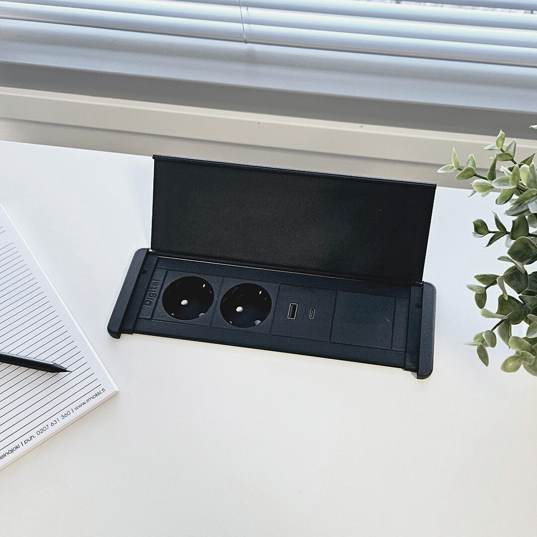 Tasoon upotettava tyylikäs kannellinen pistorasia. Pistorasiassa kaksi sähköpistoketta sekä USB-A ja USB-C portit. Pistorasiakotelo on kauttaaltaan musta. Pistorasiakotelon upotussyvyys on vain 40 mm, joten se vie vain vähän tilaa asennustason alapuolelta. Kotelon minimaaliset mitat mahdollistavat sen asentamisen paikkaan kuin paikkaan. Alumiininen kansi suojaa pistokkeita pölyltä ja roiskeilta.