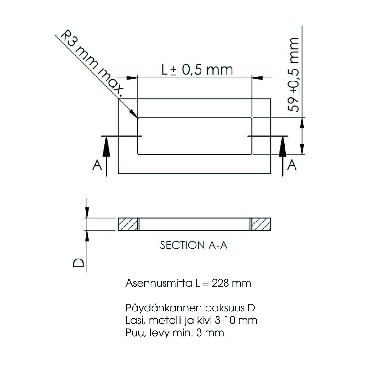 Upotusmitat: 228x 59 mm (+/- 0,5 mm)