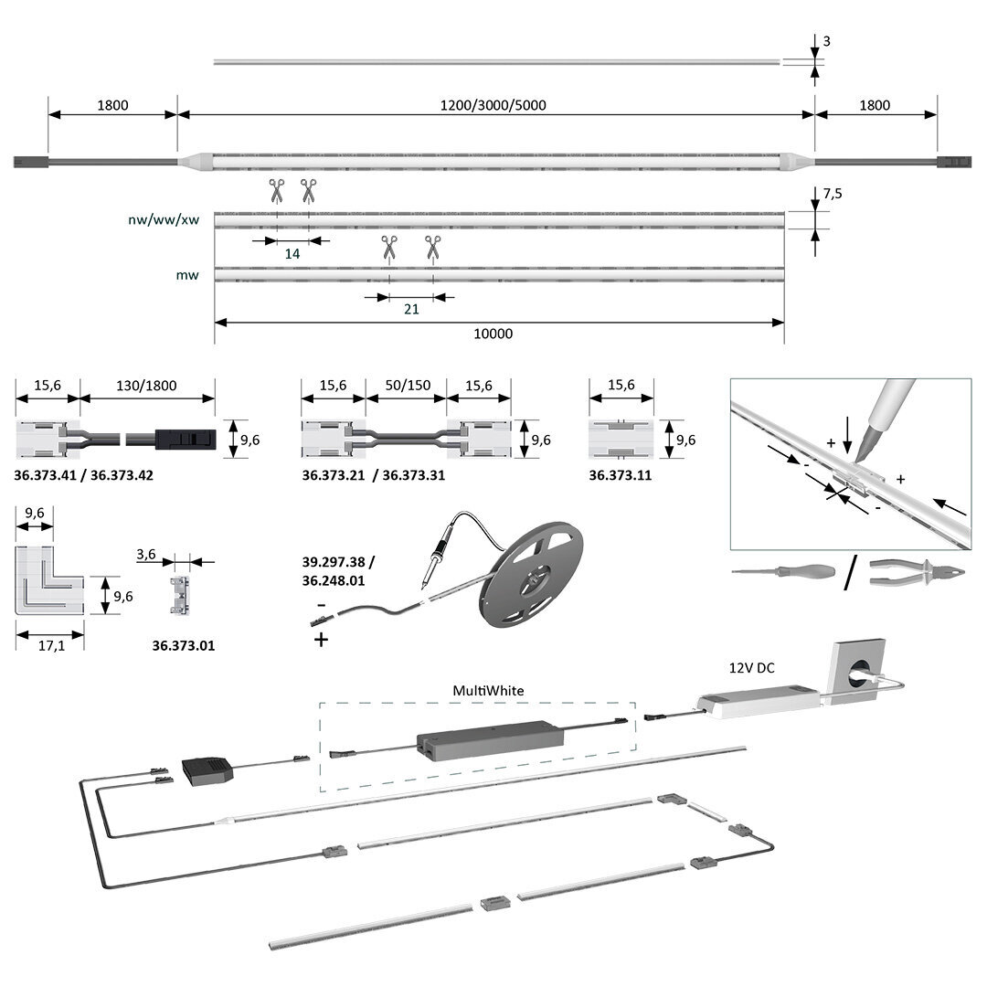 Versa Linear kulmaliitin ja suora jatkoliitin jatkavat nauhan valoa saumattomasti.