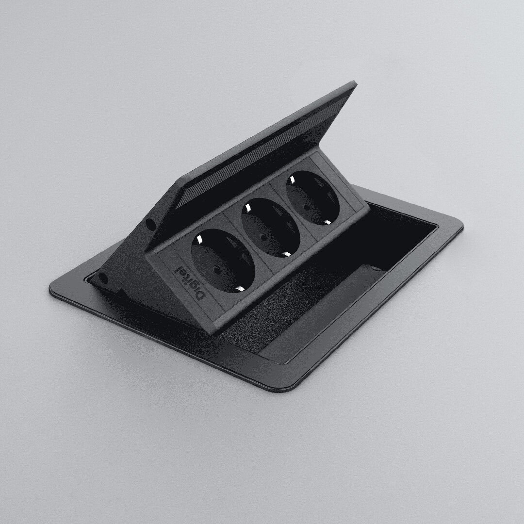 Tasoon upotettava tyylikäs pistorasia, joka aukeaa kantta painamalla. Pistorasiassa kolme pistoketta+USB+vapaa..
